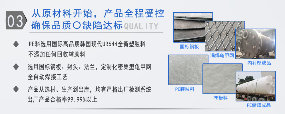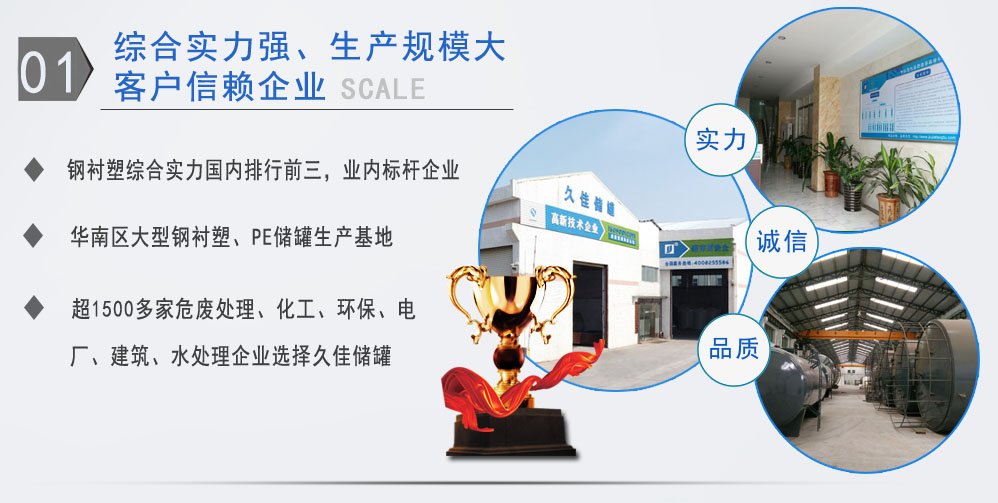 公司有鋼襯塑PE/PO、PE全塑、碳鋼、不銹鋼四大系列100多個品種,專注于常壓儲存容器生產,其產品包括鋼襯塑儲罐、管口一體成型PE儲罐碳鋼儲罐、不銹鋼儲罐、反應釜、攪拌罐、離子交換柱、鋼襯PE/PO儲罐、塑料儲罐、鹽酸儲罐硫酸儲罐等等。更大限度滿足廣大客戶的各種需求,同時可以根據客戶的需要加工定制各種防腐設備。